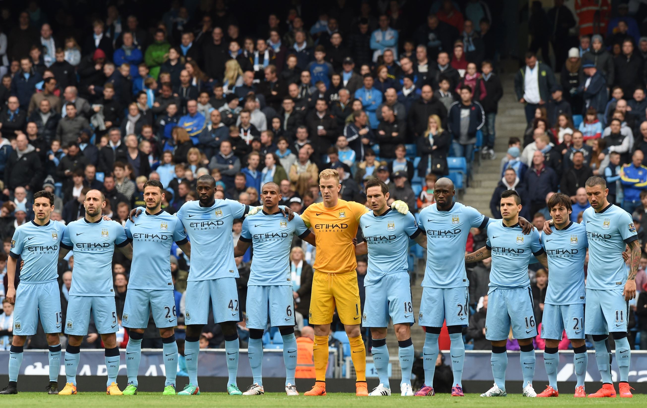 Foto: a equipa do Manchester City faz um minuto de silêncio antes de partida contra o Aston Villa no Etihad Stadium, em Manchester, Inglaterra