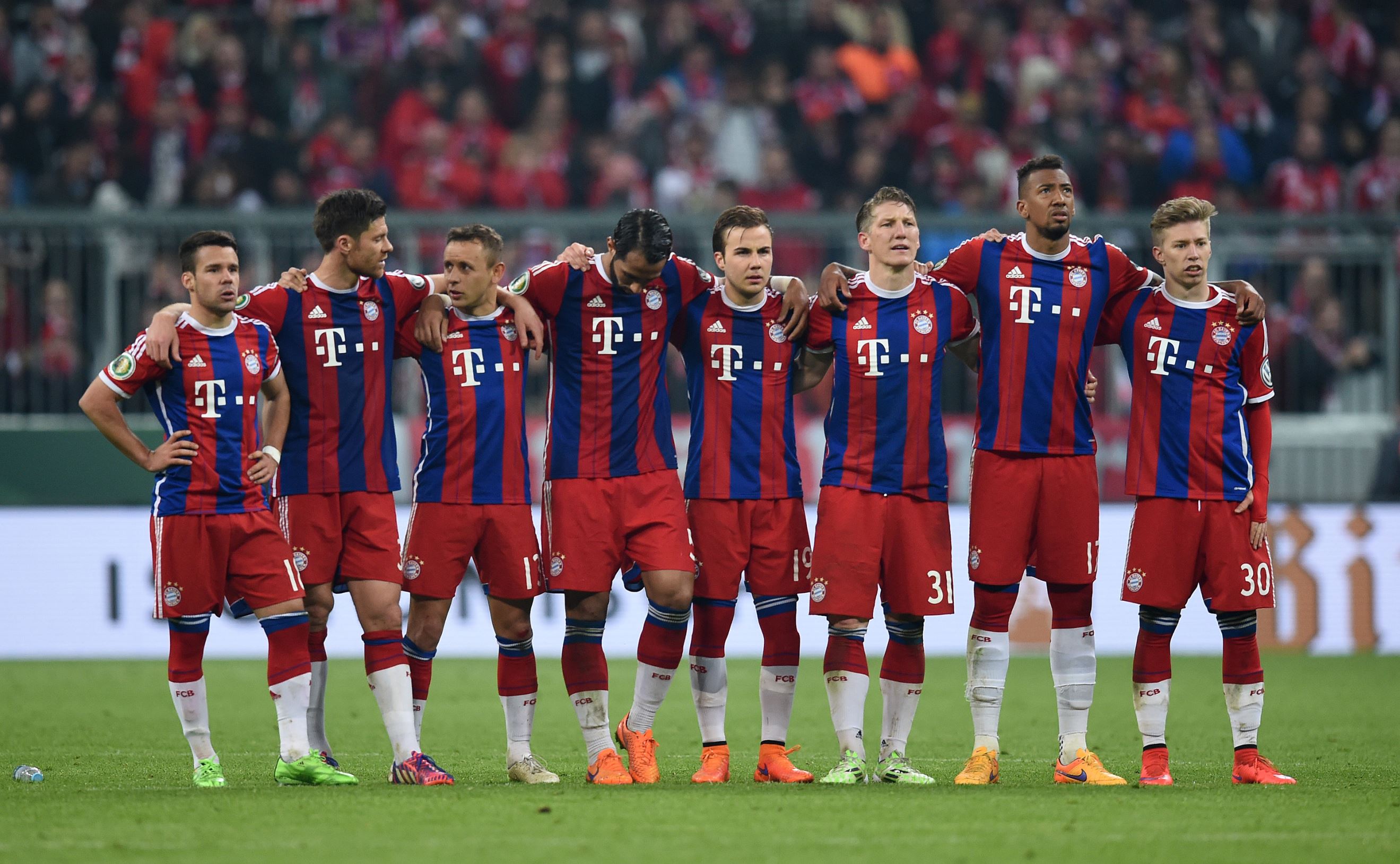 Foto: a equipa do Bayern abraça-se durante a marcação de pénaltis contra o Borussia Dortmund no Allianz Arena, em Munique, Alemanha