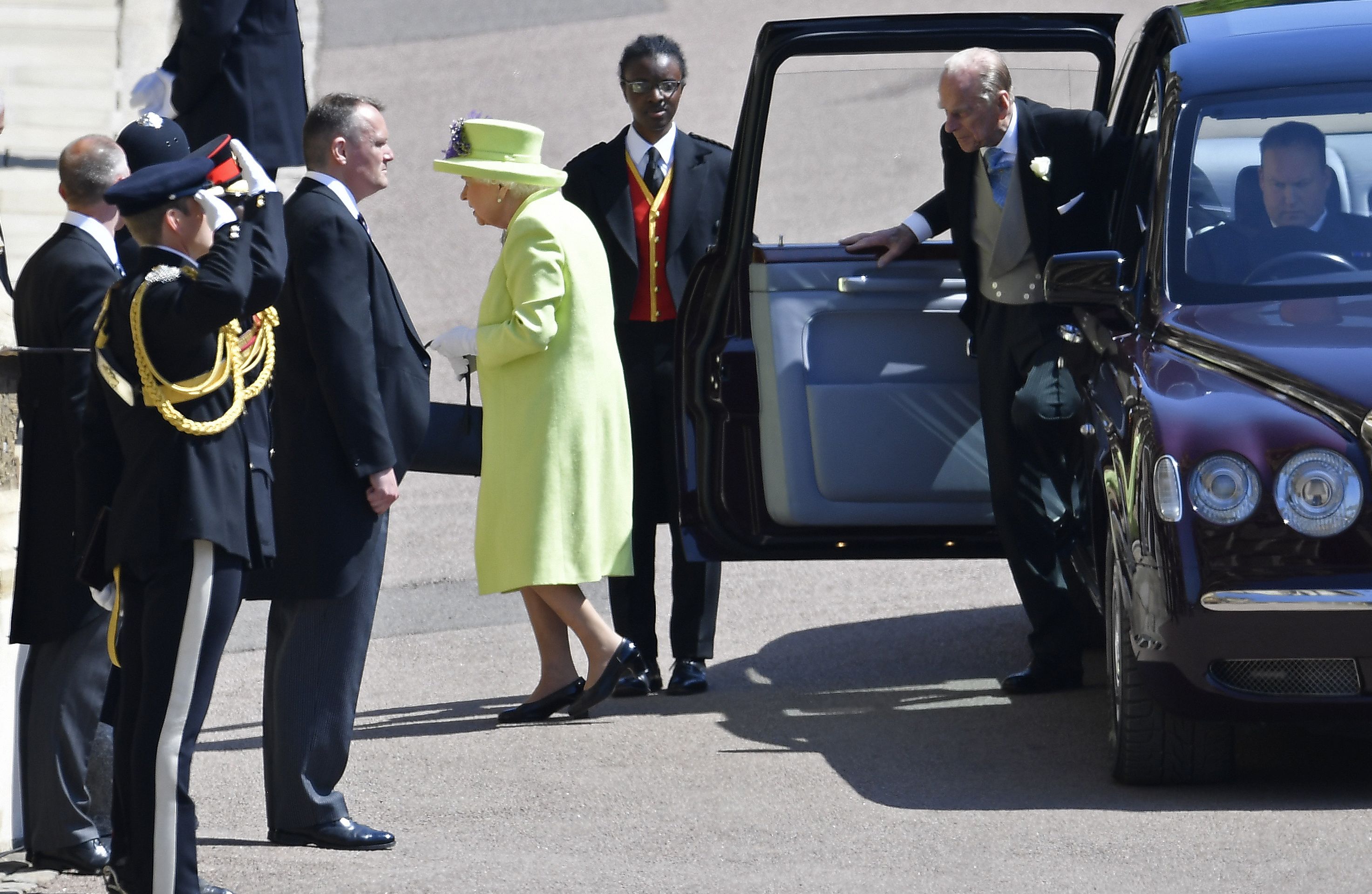 A rainha Isabel II e o príncipe Felipe, Duque de Edimburgo, chegam à capela de São Jorge, no castelo de Windsor, para o casamento