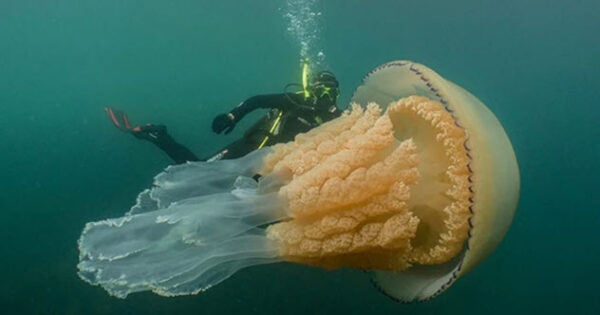 A bióloga Lizzie Daly estava mergulhando na costa da Cornualha, no Reino Unido, quando, de repente, uma água-viva gigante emerge da escuridão. A raríssima medusa da espécie barril é considerada comum em termos de conservação. No entanto, isso não significa que o animal seja fácil de encontrar. A espécie têm oito braços, que são cobertos por tentáculos pontiagudos e, supostamente, é inofensiva. A medusa pode medir até 90 centímetros de diâmetro e pesar até 35 quilos.