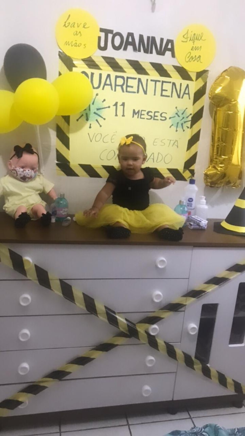A decoração teve um cartaz com a orientação: 'você não está convidado', máscara, fita de isolamento, balões e o vestido de Joanna nas cores de "atenção": preto e amarelo, além, é claro, de um frasco de álcool em gel, pra garantir a segurança da pequena.