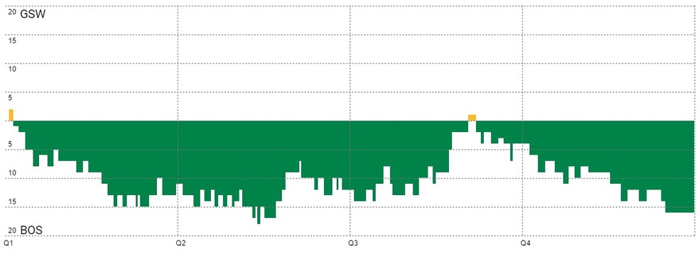 Quarto período - Celtics 23 a 11: Golden State não conseguiu igualar a intensidade dos Celtics no último quarto, quando anotaram apenas 11 pontos. Draymond Green, em uma noite abaixo da crítica, foi eliminado do jogo com 4 minutos no relógio. Stephen Curry ainda lesionou a perna numa queda com Al Horford. Boston chega ao segundo triunfo. Só faltam duas vitórias para o título.