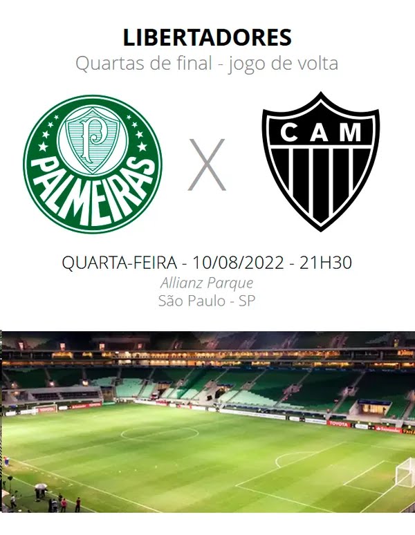 Após o jogo ficar empate no Mineirão, o Palmeiras vai tentar decidir seu jogo em casa, onde vem com um histórico de 17 jogos na libertadores sem perder. O Atlético Mineiro terá a missão de tentar parar essa invencibilidade e seguir para a semifinal. Jogo de hoje será no Allianz Parque.