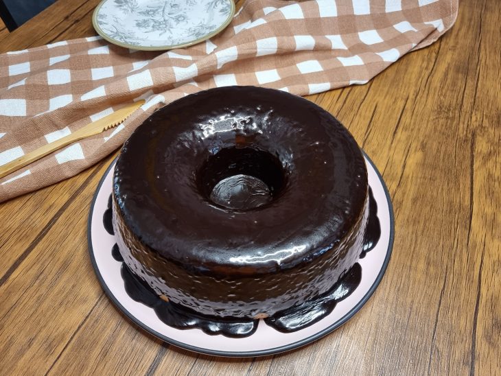 Desenforme o bolo, deixe ele esfriar e despeje a calda por cima, espalhando bem;