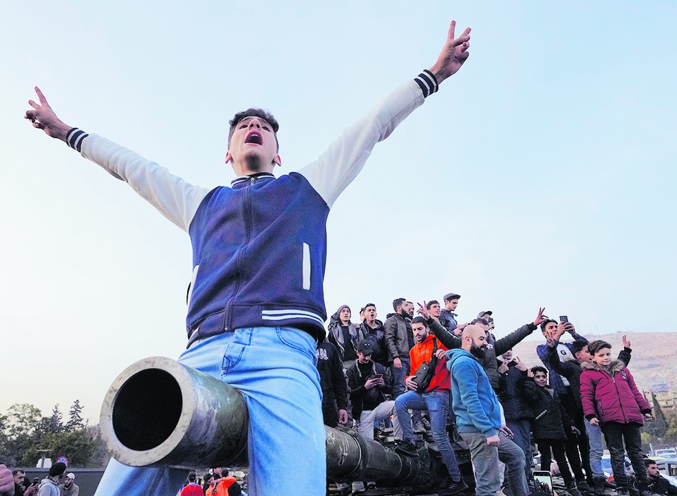 Um dia após entrarem em Damasco, os insurgentes assumiram o comando das instituições governamentais na capital e disseram que estavam protegendo os prédios públicos de saques e vandalismo, após casos registrados no dia da invasão. Eles anunciaram as primeiras medidas, como a anistia para todos os militares do exército do governo de Assad e informaram que não ditarão regras de vestimenta para as mulheres. Na foto, população ainda festejava ontem a tomada de Damasco pelos rebeldes.