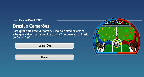 No dia de hoje (02/12/2022), teremos mais um jogo do nosso Brasil! Só que dessa vez será contra a seleção Camarões! Que tal torcer para o nosso querido país dentro do Habbo Hotel também?