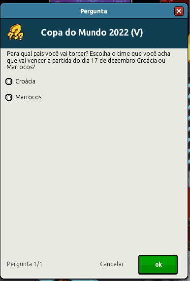 Amanhã, dia 17 de dezembro terá um jogo entre Croácia e Marrocos! E dessa vez, a votação foi liberada por meio de formulário que se encontra na recepção do Habbo. O jogo será às 12h BR / 15h PT! Vote antes do dia 17/12!