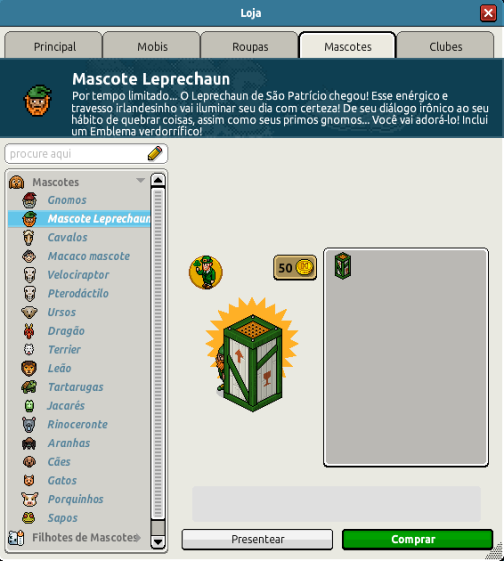 1º Passo: Abra a loja do Habbo Hotel e vá até a seção Mascotes > Mascotes > Mascote Leprechaun.