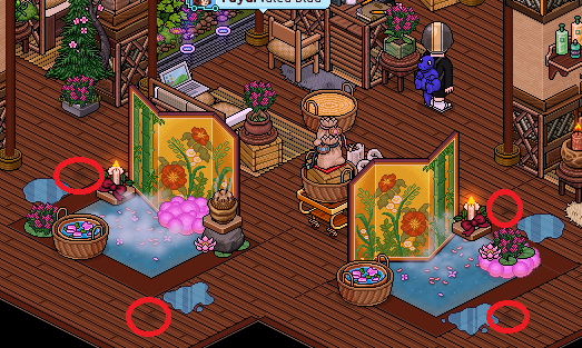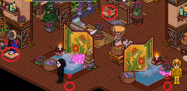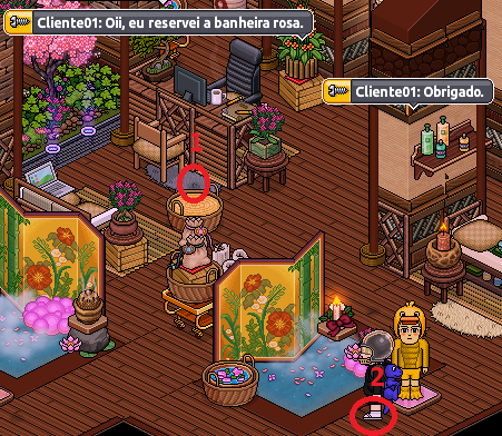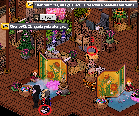 6° Passo: Depois, pegue as essências indo até o piso colorido laranja e dizendo * (asterisco). Em seguida, leve até os clientes (de ambas as banheiras) e diga * (asterisco). Você receberá uma confirmação. Após receber a confirmação, vá até a cadeira da recepção e use o comando "acenar (o/)" para vencer o jogo;