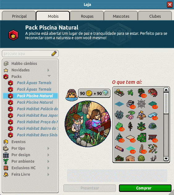 Nesta quarta-feira (15/03) o Habbo Hotel Luso Brasileiro disponibilizou para os usuários o Pack Águas Termais. O pack está disponivel na loja com preço de 90 câmbios e 90 diamantes ou por 199 câmbios, e também se encontra no Habbo Shop com preço de R$ 37,90 BR e 10,99 € e acompanha um emblema exclusivo em sua compra. Confira abaixo mais informações: