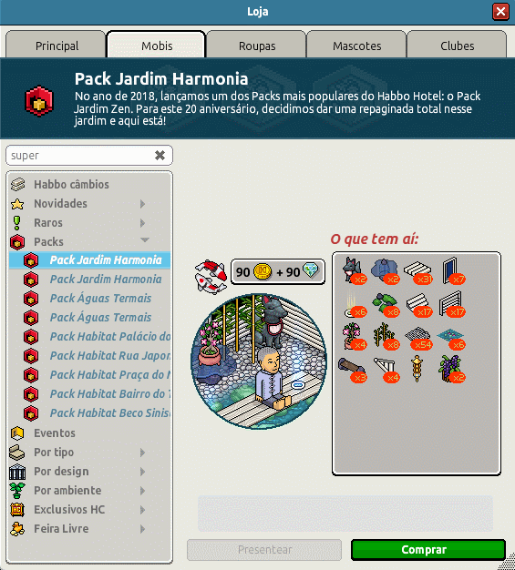 Nesta segunda-feira (20/03) o Habbo Hotel Luso Brasileiro disponibilizou para os usuários o Pack Jardim Harmonia. O pack está disponivel na loja com preço de 90 câmbios e 90 diamantes ou por 199 câmbios, e também se encontra no Habbo Shop com preço de R$ 37,90 BR e 10,99 € e acompanha um emblema exclusivo em sua compra. Confira abaixo mais informações: