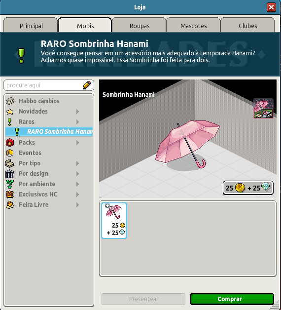 Na manhã desta sexta-feira (24/03), o Habbo Hotel Luso Brasileiro, disponibilizou no catálogo um novo raro. O raro disponibilizado é a "Sombrinha Hanami" que pode ser adquirido no preço de 25 câmbios e 25 diamantes. Além do raro, o usuário que adquirir levará um emblema exclusivo. Confira abaixo mais informações: