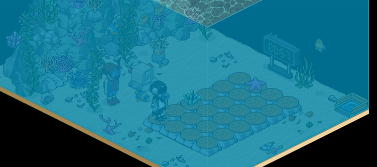 4° Passo: Você terá 1 minuto para completar. Nesta estapa, o objetivo do jogo, é você conseguir marcar 5 pontos no jogo. Para isso, clique 2 vezes no mobi "Queijo Fedorento" que estiver o "Coral Verde" em cima. A cada vez que você clica, você marca 1 ponto. A estrela do mar que está sobre eles, não pode encostar em você, caso encoste, será kickado do jogo. Ao finalizar os 5 pontos, você deverá acenar (falando o/) para ser teleportado para o tele;