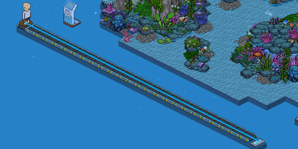 Durante o percurso, duas "Bolhas Subaquáticas" estão em um local alto, você deverá usar o comando :up para que o piso colorido suba na mesma altura que a bolha, logo apos sentar na bolha, retorne para o piso colorido. Repita isso até chegar no "Botão Verde", clique duas vezes no mesmo para ser teleportado para o "Mecanismo de Batalha";