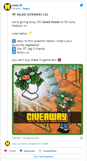Habbos! Este mês, vamos realizar doações todas as semanas do item exclusivo Cabeça Vegana em nossa conta global oficial do Twitter.