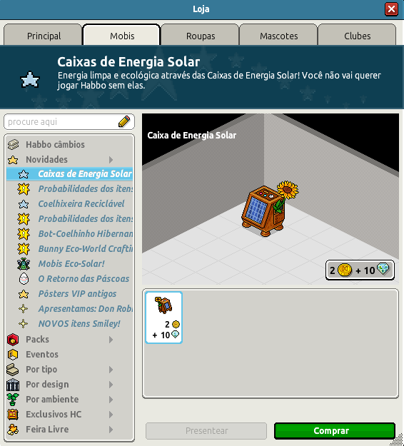 O Habbo Hotel Luso Brasileiro está em constante movimentação para trazer novidades para os usuários. No mês de Abril, o tema que o Habbo trouxe para comunidade foi o "Eco-Solar", disponibilizando emblemas, raros e mobis para os usuários de sua comunidade. Na manhã desta terça-feira, foi disponibilizado para venda, o mobi transformável "Caixa de Energia Solar" que pode ser adquirido pelos usuários por 2 câmbios + 10 diamantes. O usuário poderá ganhar um de três mobis. Confira abaixo mais informações: