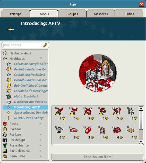 Nesta semana, o Habbo Hotel Luso Brasileiro, disponibilizou no catálogo uma nova coleção de mobis. A coleção disponibilizada é a coleção AFTV. Confira mais informações abaixo: