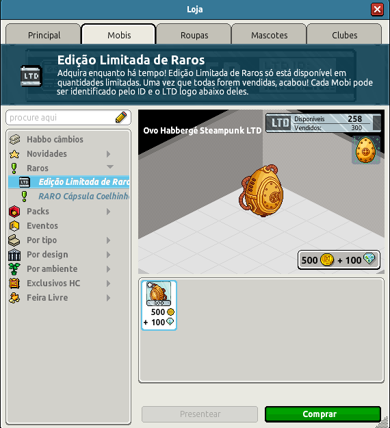 Nesta quinta-feira (27/04), o Habbo Luso Brasileiro, disponibilizou um novo Raro de edição limitado (LTD). O raro é um "Ovo Habbergé Steampunk LTD" e foram disponibilizados apenas 300 lotes para os usuários. O mesmo pode ser adquirido pelo preço de 500 câmbios + 100 diamantes. Confira mais informações abaixo: