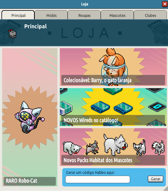 Na manhã do dia 26/05 um novo raro foi disponibilizado para a comunidade luso-brasileira do Habbo Hotel. É o Robo-cat, imprevisível e fofinho! Ele foi disponibilizado por 25 câmbios + 25 diamantes e comprando na loja você receberá um emblema exclusivo do raro. Confira abaixo: