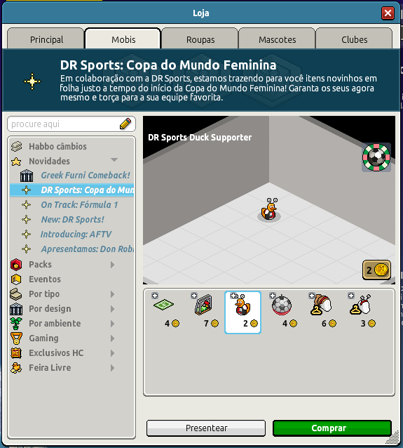 No dia 17/07/2023 (17 de Julho de 2023), em uma emocionante parceria com a renomada DR Sports, o Habbo acaba de lançar uma coleção imperdível de itens temáticos, perfeitos para celebrar a tão aguardada Copa do Mundo Feminina! Aproveite esta oportunidade única para garantir os seus mobis exclusivos e entrar no clima de torcida junto com jogadores e jogadoras de todo o mundo.