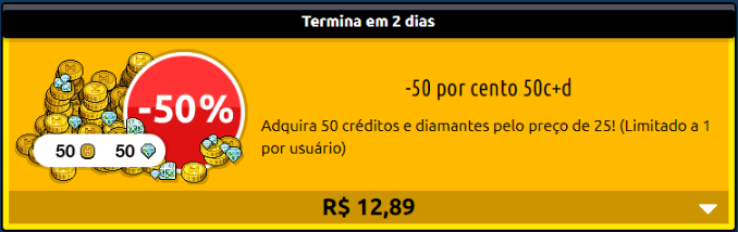 50% de desconto para adquirir 50 câmbios + 50 diamantes (Obtenha o dobro pelo preço de 25 câmbios)