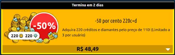 50% de desconto para adquirir 220 câmbios + 220 diamantes (Obtenha o dobro pelo preço de 110 câmbios)