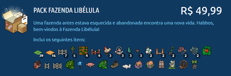 Na manhã da última quinta-feira (07/03), o Habbo disponibilizou um novo pack para a comunidade, o Pack Fazenda Libélula. O mesmo pode ser adquirido através da loja por 90 moedas + 90 diamantes ou 199 moedas, também estando disponível na HabboShop por R$49,99. Os usuários que comprarem, também receberão um emblema exclusivo. Confira abaixo mais informações: