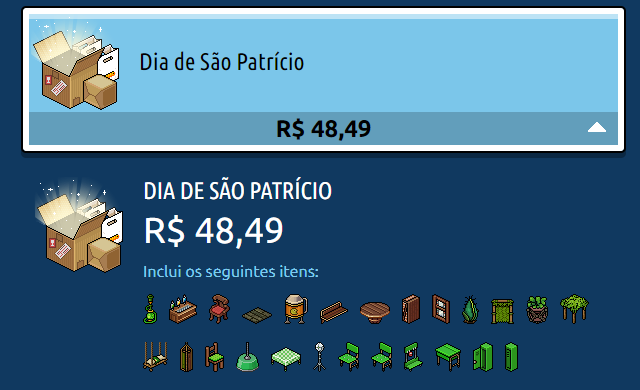 Nesta semana, chegou ao Habbo uma nova oferta. Trata-se da Oferta Dia de São Patrício, que pode ser adquirida apenas pela Habbo Shop por R$ 48,90 ou 11,49 €, acompanhado de um emblema EXCLUSIVO. Confira mais informações: