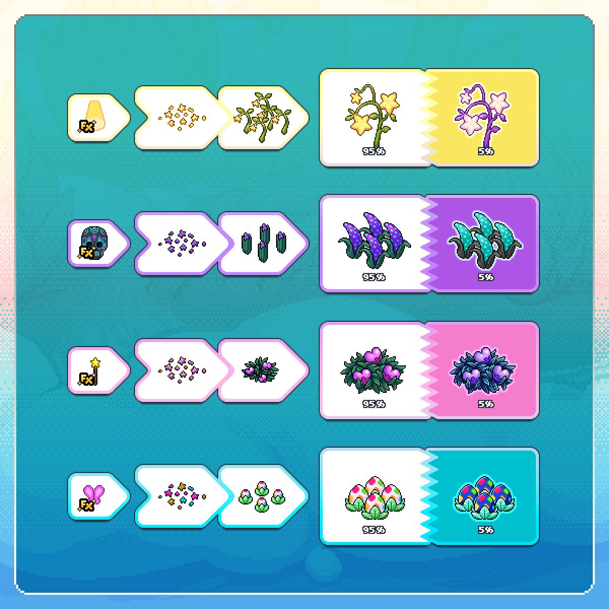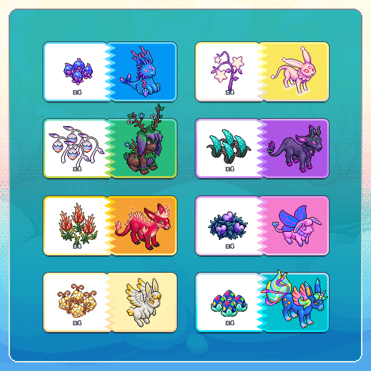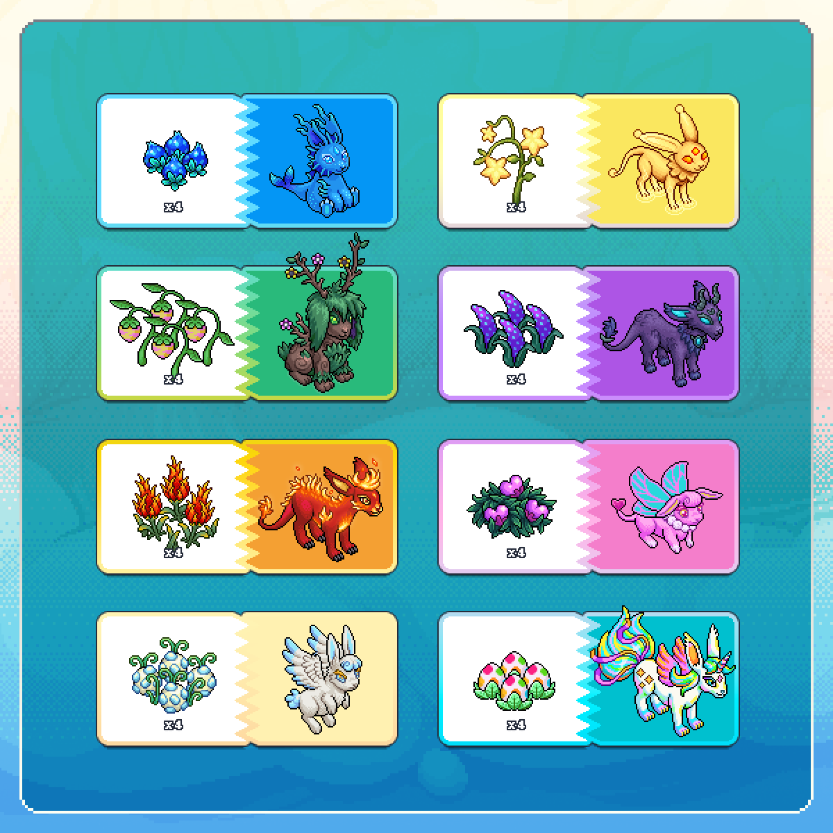 *Você receberá um Pompom Coelhinho Colorido e 1 emblema exclusivo por criar as Criaturas Elementais normais, bem como um Pompom Coelhinho Dourado e 1 emblema exclusivo por criar Criaturas Elementais Deslumbrantes.