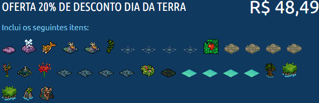 Na manhã desta terça-feira o Habbo disponibilizou uma oferta exclusiva para o dia da Terra, dando 20% de desconto em itens relacionados a este dia tão especial. Ao todo são 33 mobílias que vem nesta oferta e seu preço ficou definido como R$ 48,49 e 11,49 €. Confira abaixo os detalhes.