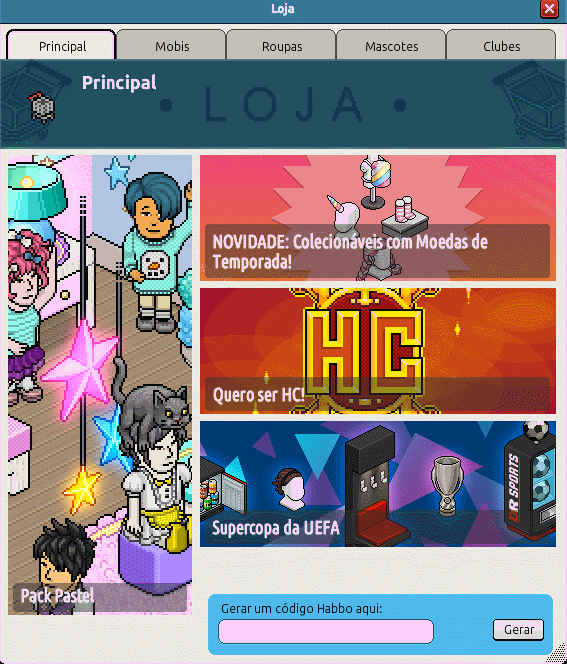 A Segunda-feira (22/04/24) começou com novidades no catálogo do Habbo Hotel, se você abriu a loja reparou no novo Pack Pastel, um dos queridinhos da comunidade devido aos lindos mobis que entregam está linha específica do jogo. Você pode compra-lo por um valor de 45c + 45d ou 99c, e com isso ganhará um Emblema Exclusivo.