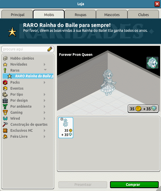 Na manhã desta Sexta-feira (04/10), foi lançado no catálogo do Habbo Hotel Luso Brasileiro o Raro Rainha do Baile para sempre. O item pode ser adquirido por 35 câmbios + 35 diamantes e inclui um emblema exclusivo. Aproveite, pois o Raro estará disponível no catálogo por tempo limitado!