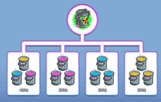 40% de chance: x1 Tinta Azul + x1 Tinta Rosa + x1 Tinta Amarela