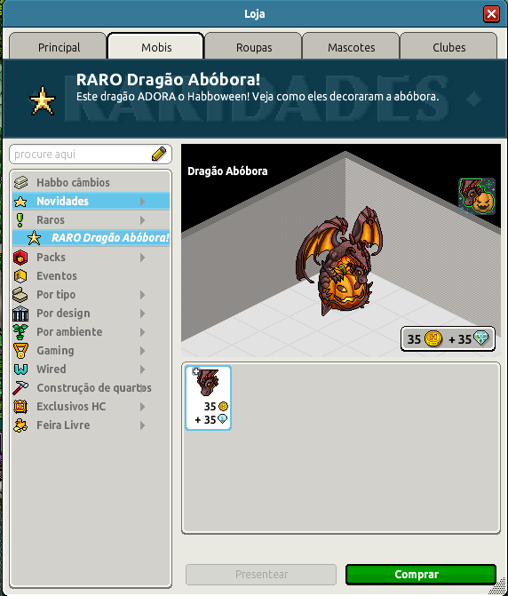 Na manhã desta Sexta-feira (18/10), foi lançado no catálogo do Habbo Hotel Luso Brasileiro o Raro Dragão Abóbora. O item pode ser adquirido por 35 câmbios + 35 diamantes e inclui um emblema exclusivo. Aproveite, pois o Raro estará disponível no catálogo por tempo limitado!