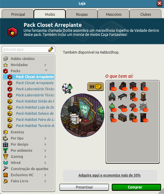 Nesta Terça-feira (22/10), foi disponibilizado no catálogo do Habbo Hotel Luso Brasileiro o Pack Closet Arrepiante. Os usuários podem adquiri-lo por 45 câmbios + 45 diamantes ou 99 câmbios. O pack também está disponível no Habbo Shop por R$ 24,99 ou 5,49 €. Além disso, inclui um emblema exclusivo.