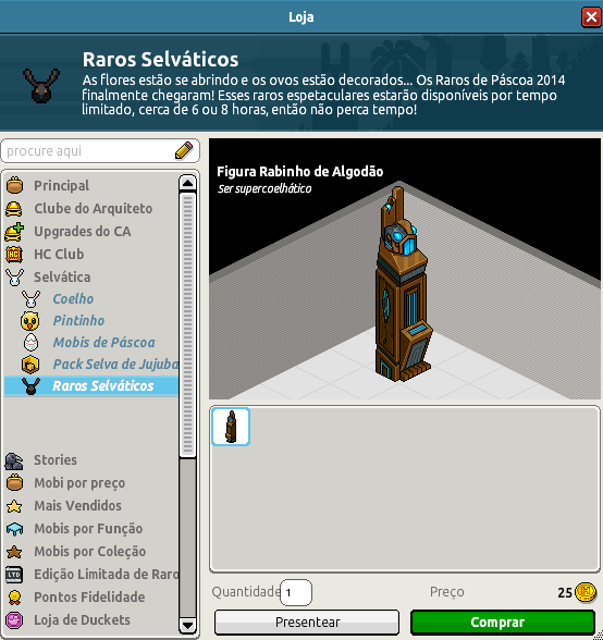Hoje (19/04), a poucos minutos foi hospedado o 3º e último raro de páscoa. A "Figura Rabinho de Algodão". Este raro está sendo disponibilizado por 25 câmbios, igualmente aos raros anteriores. Corra já para comprar o 3º raro de páscoa, pois vai estar no catálogo por 6 ou 8 horas.