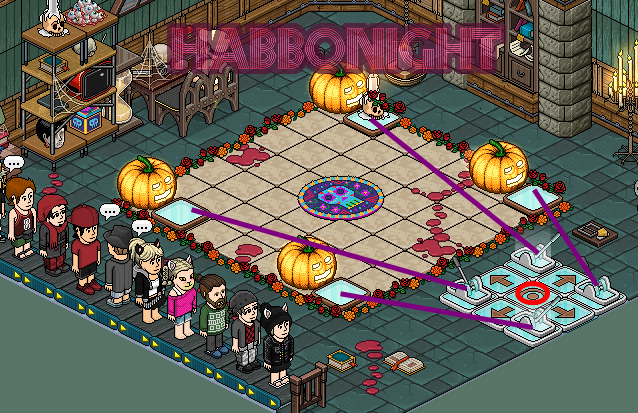 Na sua vez utilizando os Piso de Seta leve o Castiçal de Crânio até os Piso Colorido e deixe-os na cor Branco puxando as Alavancas de Chão. Você terá apenas 1 minuto para acender todas as Lâmpadas de Abóbora. Após concluir tudo, pise no Piso de Anel para receber o seu emblema.