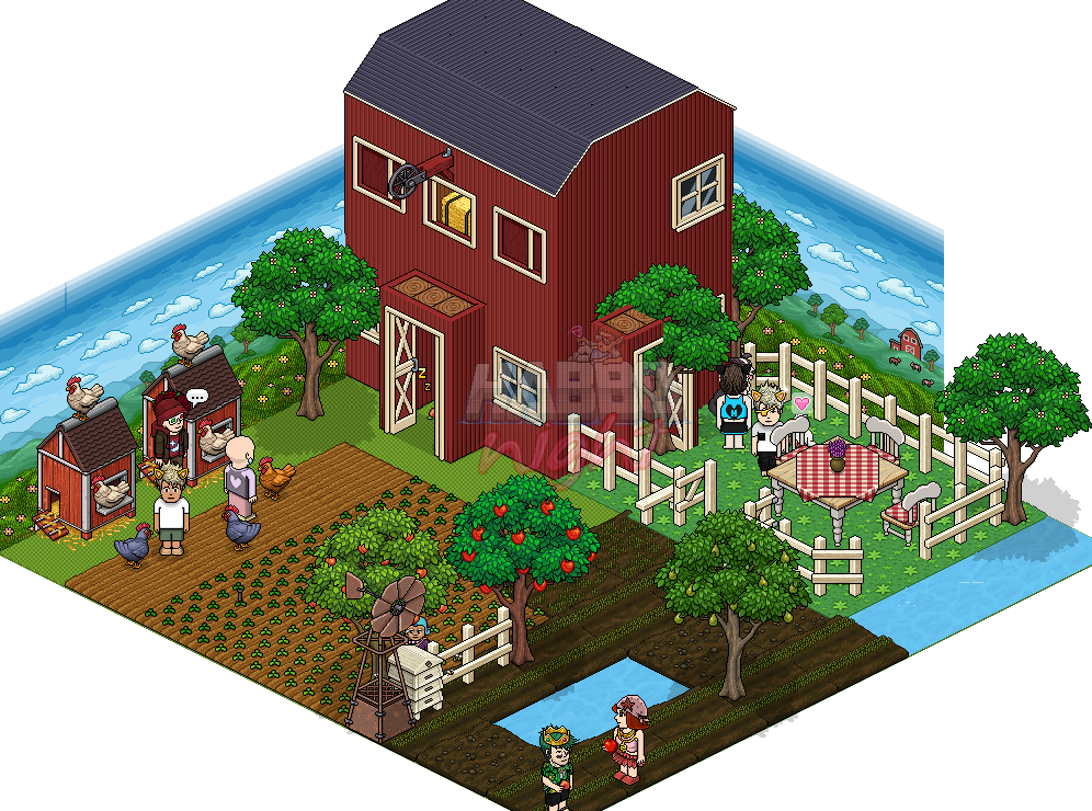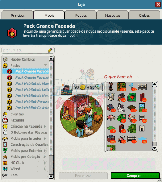 Pensando nisso, hoje (03/04) foi disponibilizado mais um incrível pack, cujo nome é Grande Fazenda, que retrata esse mundo rural. Ele está sendo vendido por 199 câmbios, ou por 90 câmbios mais 90 diamantes, e também poderá ser adquirido pela HabboShop pelo preço de R$ 26,00, que poderá ser pago com cartão de crédito ou boleto bancário. Ele vem acompanhado de um emblema exclusivo.