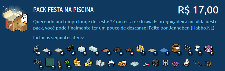 Hoje (25/09) um novo pack foi disponível no Habbo Hotel BR/PT. "Pack Festa na Piscina" traz 90 mobílias incríveis e um emblema exclusivo, confira: