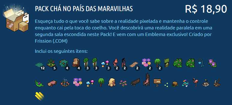 Hoje (08/04), o hotel disponibilizou o segundo Pack da Campanha de Páscoa denominado como "Pack Chá no País das Maravilhas". Este pode ser adquirido na loja de três formas: 45 câmbios + 45 diamantes, por apenas 99 câmbios ou na página de créditos por R$ 18,90. De brinde, ele vem companhado de um emblema exclusivo. Confira: