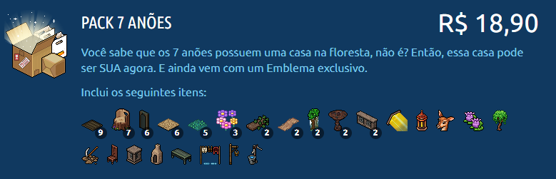 Esta semana, o hotel disponibilizou mais um Pack da Campanha de Páscoa denominado como "Pack 7 Anões!". Este pode ser adquirido na loja de três formas: 45 câmbios + 45 diamantes, por apenas 99 câmbios ou na página de créditos por R$ 18,90. De brinde, ele vem companhado de um emblema exclusivo. Confira: