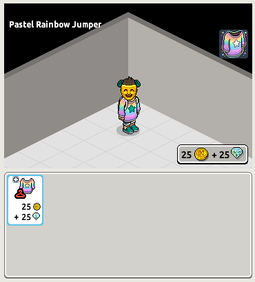 Hoje (28/05), foi inserido no catálogo de todos os hoteis, um incrível visual RARO denominado "Suéter Arco-Íris Pastel". Este raros pode ser adquirido pelo preço de 25 câmbios e 25 diamantes, e vem acompanhado de um emblema EXCLUSIVO. Confira: