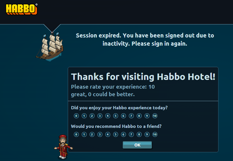 Ao deslogar da sua conta no Habbo, e ir para a página conhecida como "Volte sempre", alguns Habbos são convidados a participar de uma pesquisa de satisfação.