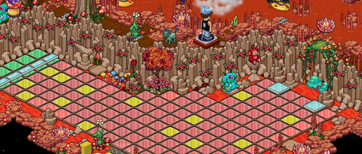 3° Passo: O objetivo do jogo é atravessar todo o percuso e chegar no pisos pressionáveis. Todavia, para chegar nos pressionáveis você deverá pisar nos pisos coloridos na cor AMARELA, que estarão se alternando para vermelho. A cor vermelha kika da sala! Este jogo é de habilidade e você terá 1:30 para fazer esta travessia;