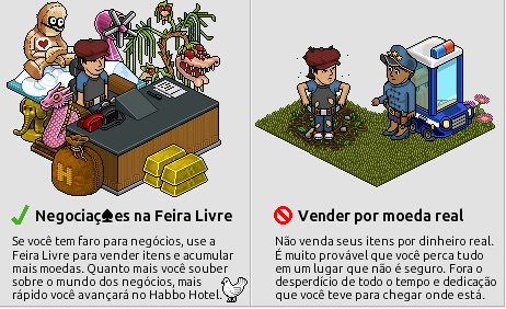 Páginas da web que ofereçam moedas grátis, Mobis, VIP, Raros, ou digam ser o novo Habbo Hotel ou página da Equipe são todas falsas e foram criadas para roubar os seus dados pessoais. Nunca escreva seu email ou senha nessas páginas ou faça download de qualquer documento que eles ofereçam. Eles podem ter softwares ladrões que copiem tudo que você digita em seu computador pessoal ou ainda vírus!