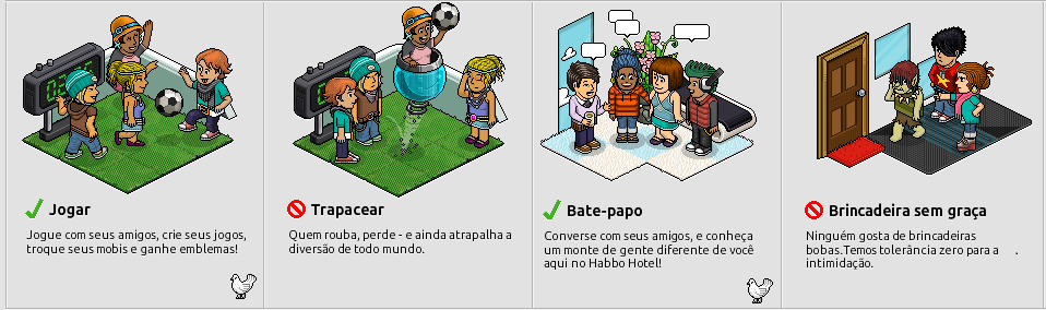 Nada mais importante do que as regras. Regras foram feitas para estabelecer um senso comum, este que lhe dá harmonia e bem estar perante tal sociedade. No Habbo Hotel, não é diferente, temos a Habbo Etiqueta, que lhe ensina como jogar harmoniosamente com a sociedade do maior Hotel de Pixels do Mundo! Veja abaixo: