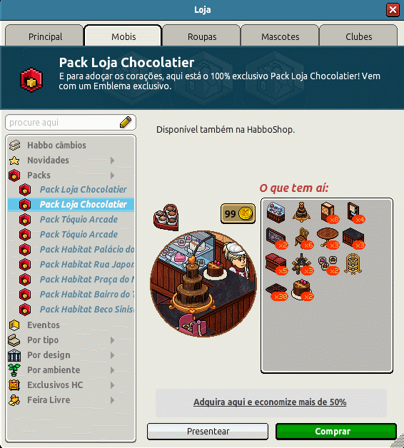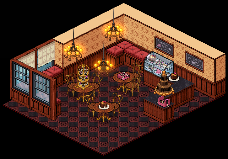 Este mês está cheio de novidades e como sabemos, diversas coisas são hospedadas no hotel, tratando-se de roupas, raros, entre outras coisas. Nesta Segunda-feira (20/06), foi retornado ao catálogo do Habbo Hotel o Pack Loja Chocolatier. O pack completo pode ser adquirido por 99 câmbios, 45 câmbios + 45 diamantes ou R$ 18.90 pela página de créditos e acompanha um emblemas exclusivo. Confira abaixo mais informações: