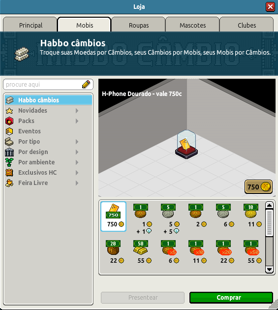 Um mês cheio de novidades, e um raro que vale 750 moedas se convertido. O Habbo lançou hoje (20/06) o raro Câmbio H-Phone Dourado! Você pode adquiri-lo pela Habbo Loja. O Raro não acompanha emblema porém não será vendido novamente. Segue abaixo mais informações: