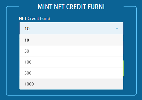2. Conecte sua carteira e vá no espaço 'MINT NFT CREDIT FURNI'. Você deve escolher o valor de Créditos NFT que deseja converter (obs: existe a taxa de 1 Crédito NFT na operação).