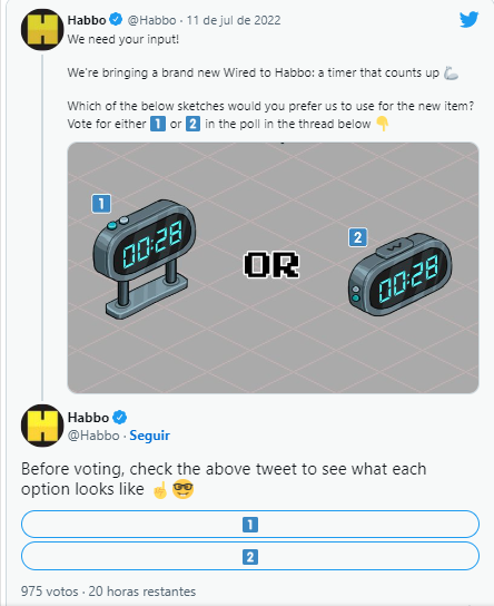 Há algumas horas, o perfil oficial do Habbo Hotel fez uma enquete através de seu Twitter, pedindo o feedback da comunidade sobre o design de um novo cronômetro wired progressivo. Você pode decidir entre a opção 1 e 2 e ajudar a escolher como será o resultado final deste novo mobi. Confira mais informações abaixo: